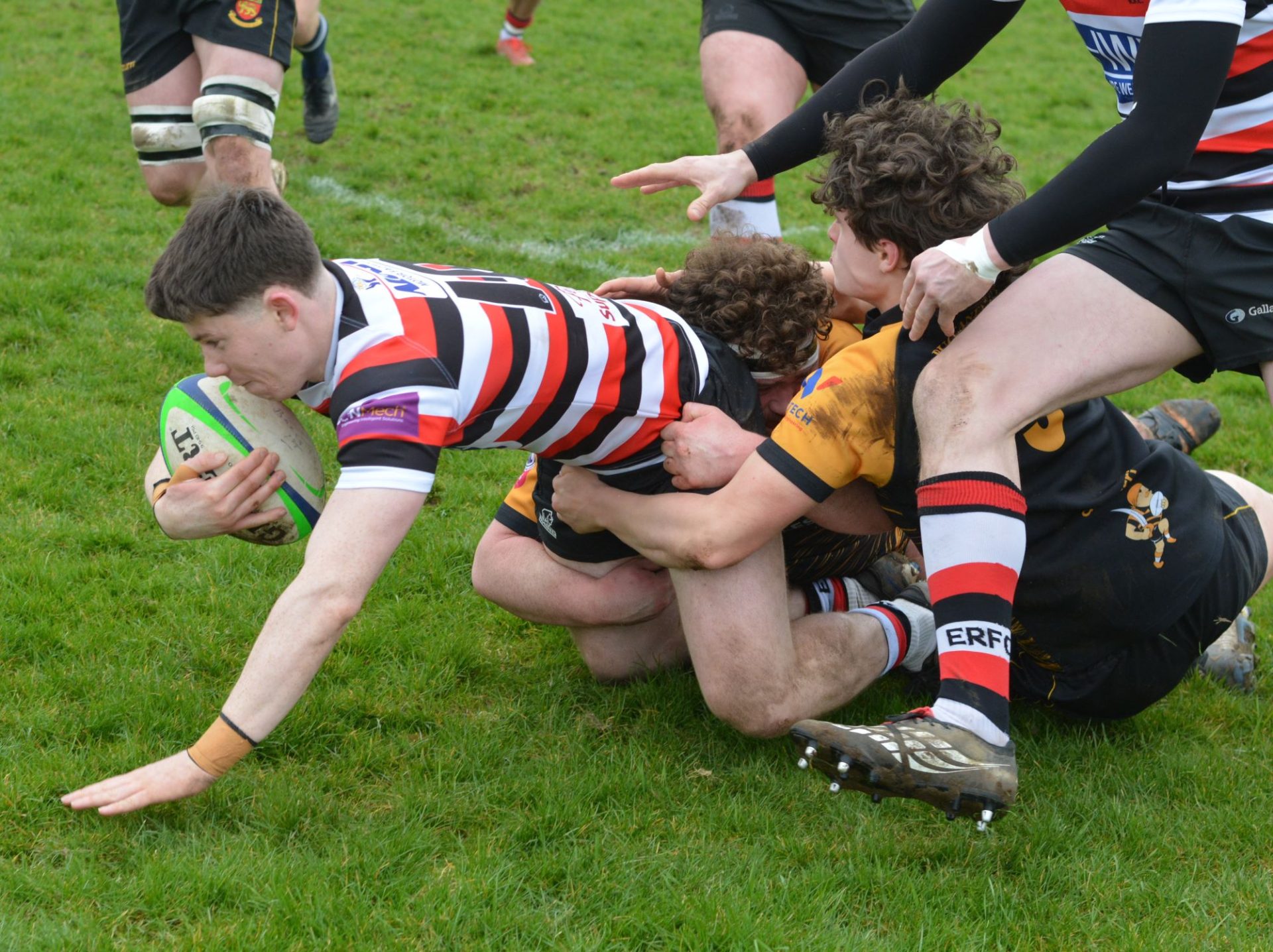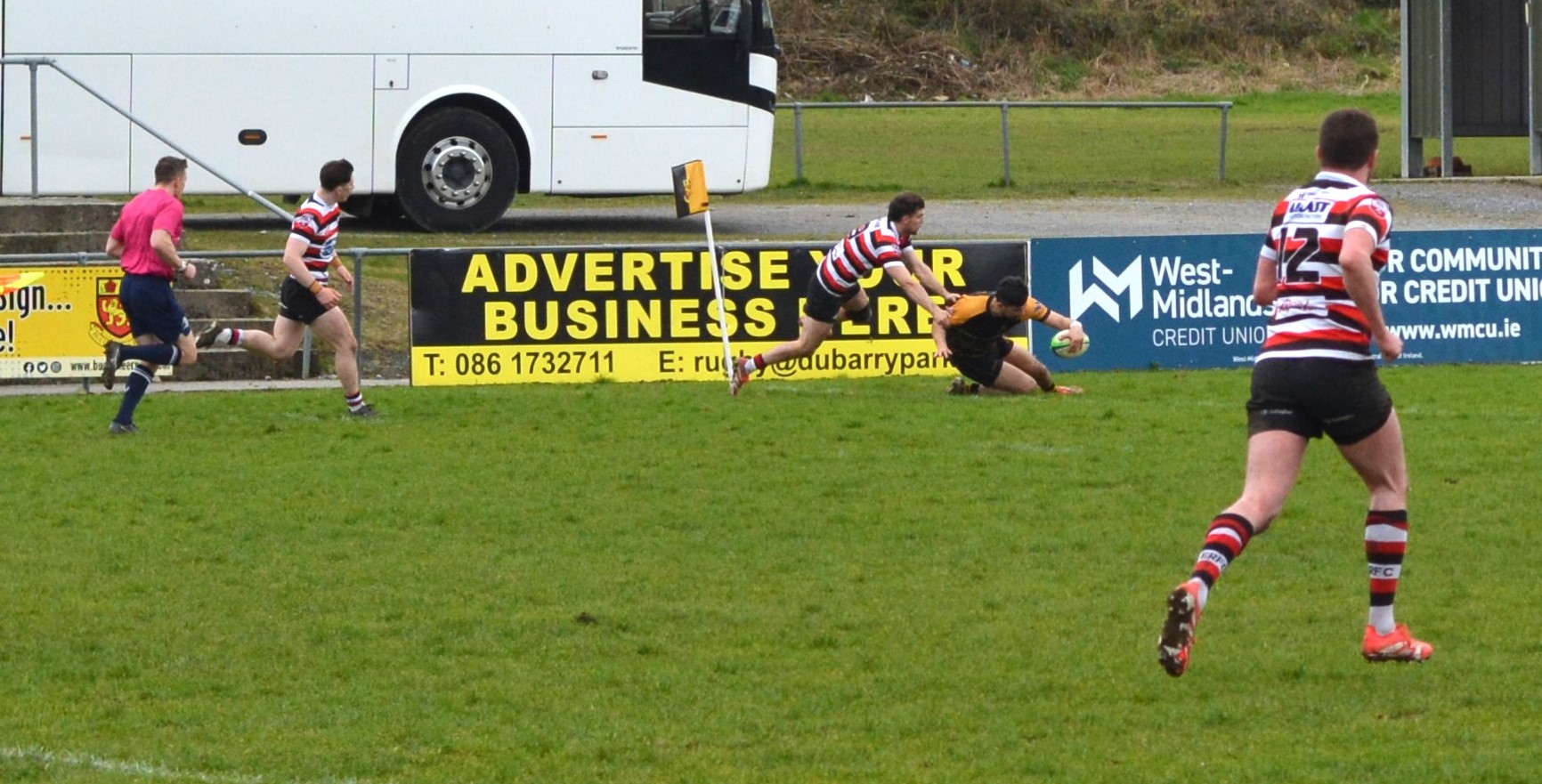 The visitors had first benefit of the strong breeze blowing from goal to goal and soon had Buccs on the back foot despite losing M.J.Doyle to an early injury. Their pressure yielded a 7th minute try by James Doyle who deftly chipped the cover to dot down at the uprights for a try converted by Conal Kervick.