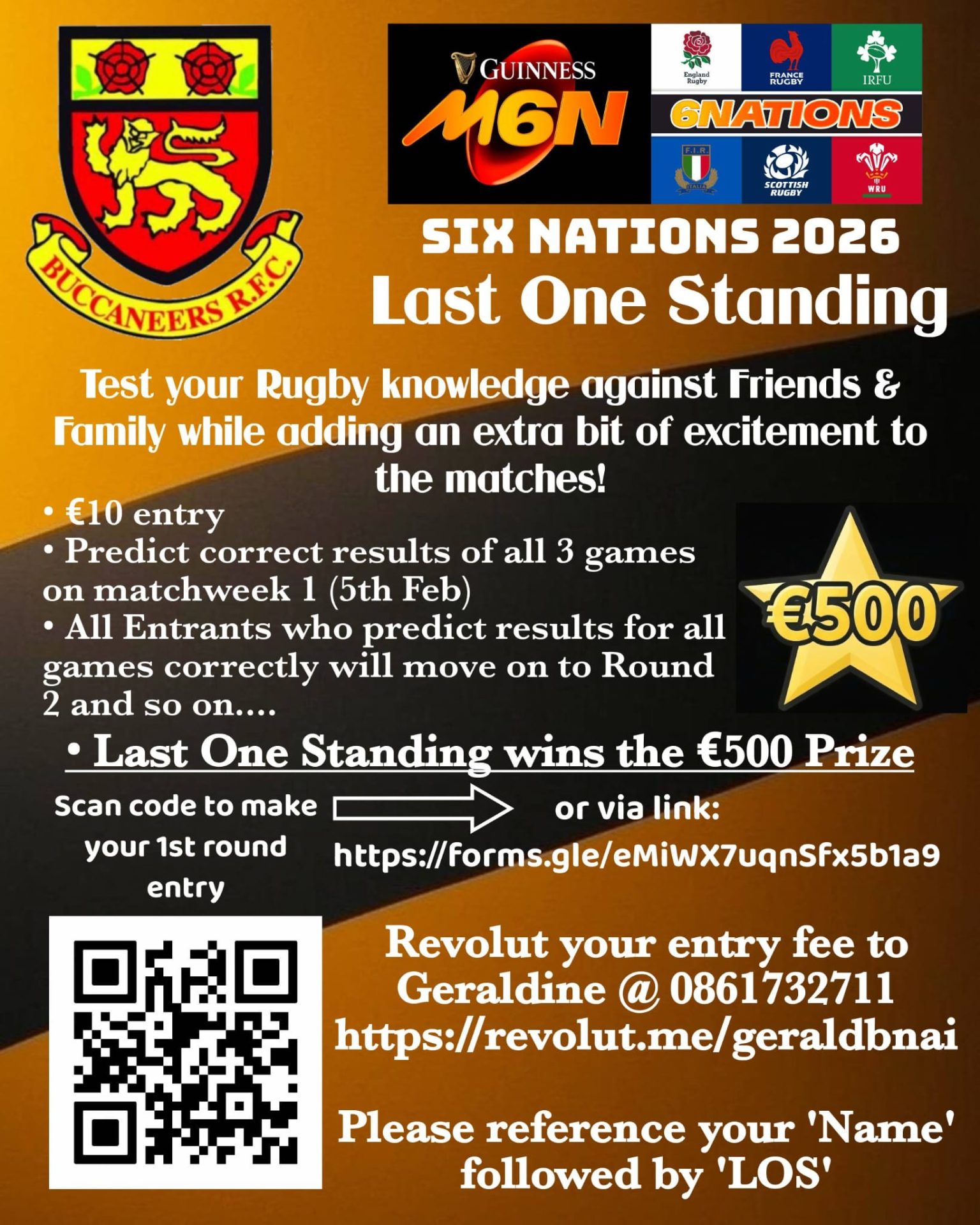 Buccaneers U-20s are organising ‘Last One Standing’ whereby you can test your rugby knowledge to predict the winning teams in each round of the Six Nations championship. Predict all the correct results in round one to advance to the next round and so on. Entry is only €10 and the star prize is €500. Revolut to Geraldine at 0861732711.