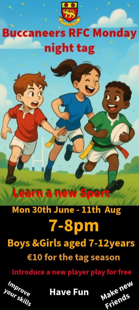 Tag Rugby for Boys and Girls aged 7 to 12 years old takes place at Dubarry Park on Monday nights from June 30th to August 11th.
