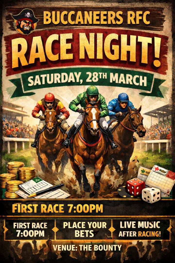 Buccaneers Senior team are hosting a Race Night in The Bounty on Saturday, March 28th, the day of our final home AIL fixture v Sligo. All support welcome. Sponsorship cards are now available from players and officials.