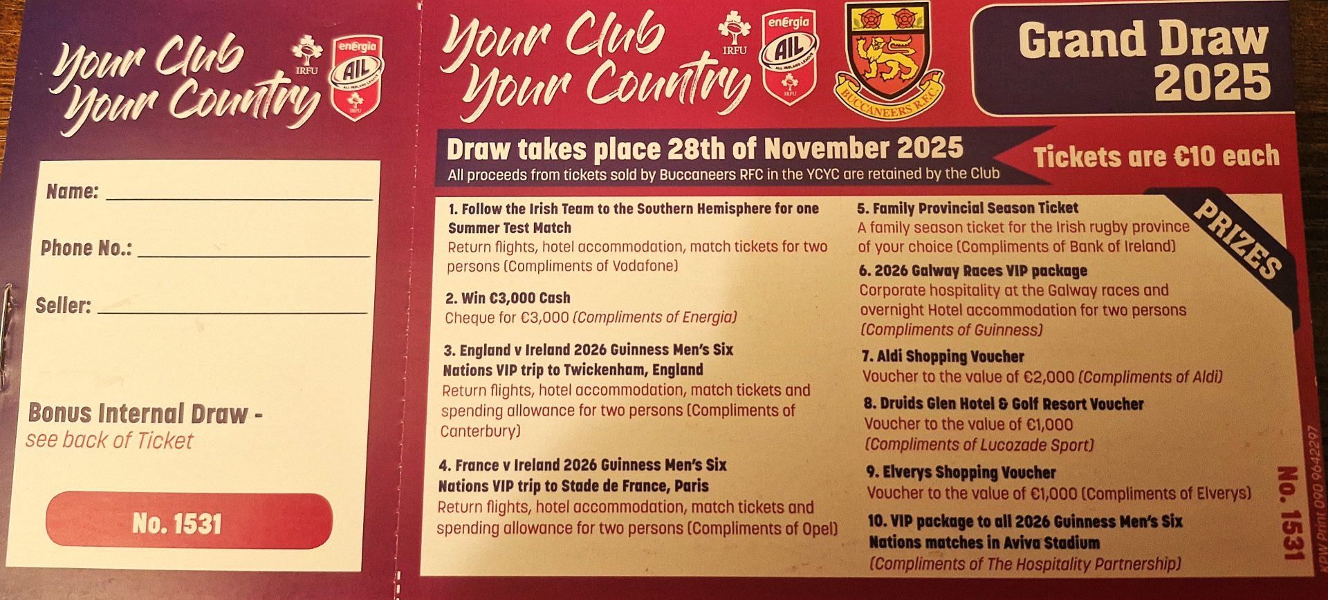 The IRFU has put the date for ‘Your Club Your Country’ Grand Draw back until December 8th so there is still time to purchase tickets. Each ticket costs just €10 and the proceeds of all tickets sold by the club is retained by the club so it is a highly valuable fundraiser.